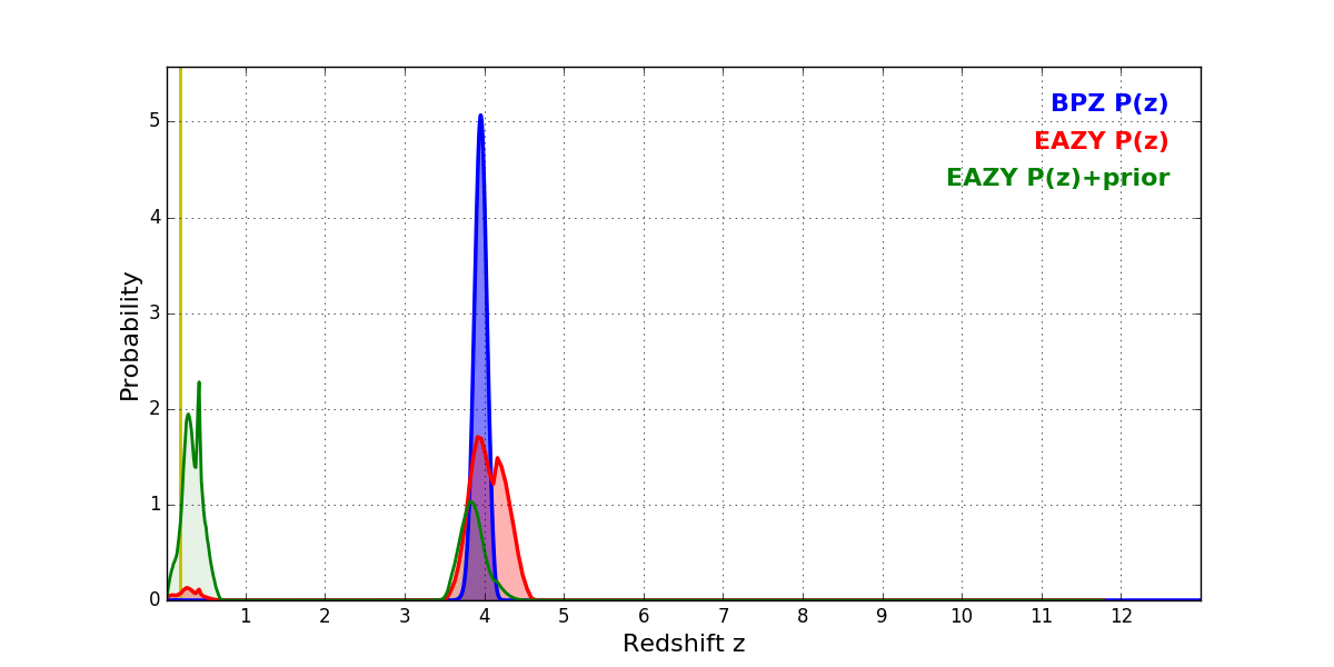 In P(z) plots: Yellow lines mark the cluster redshift z = 0.182,