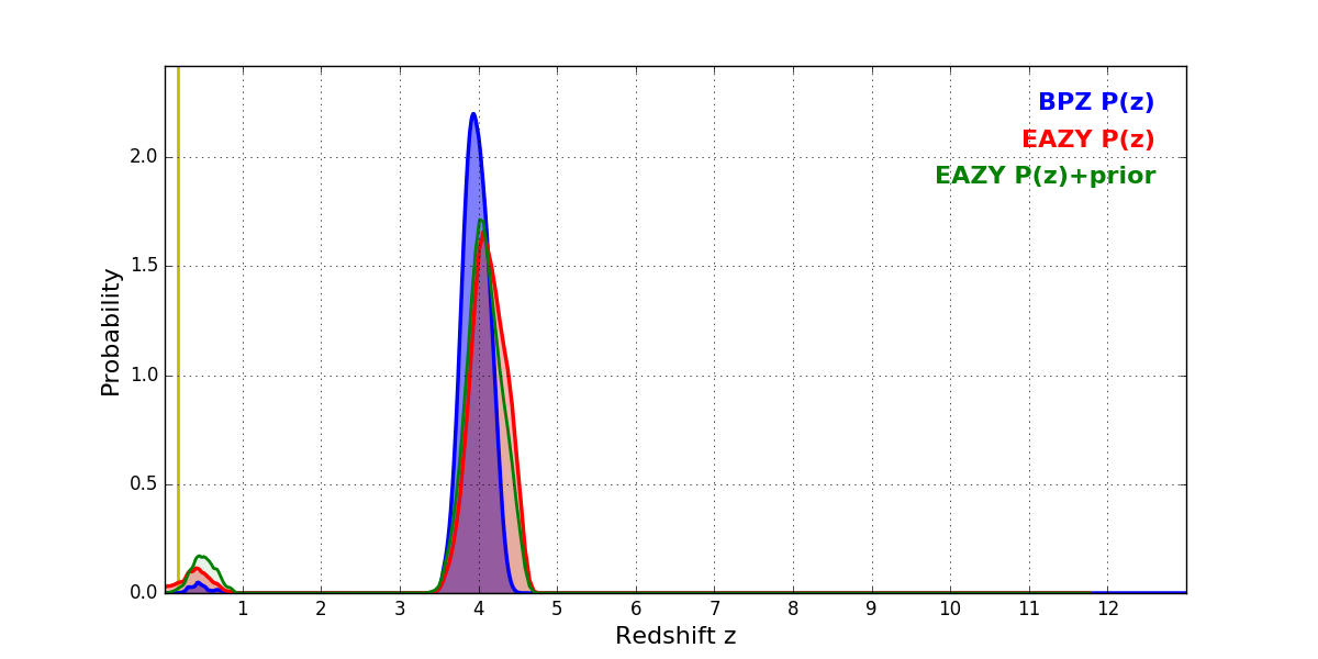 In P(z) plots: Yellow lines mark the cluster redshift z = 0.182,