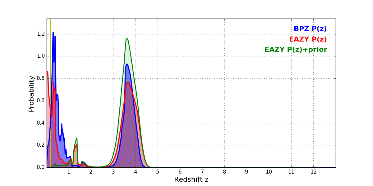 In P(z) plots: Yellow lines mark the cluster redshift z = 0.182,