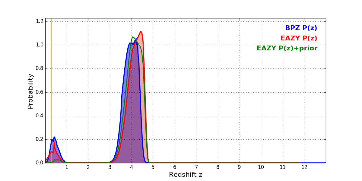 In P(z) plots: Yellow lines mark the cluster redshift z = 0.282,