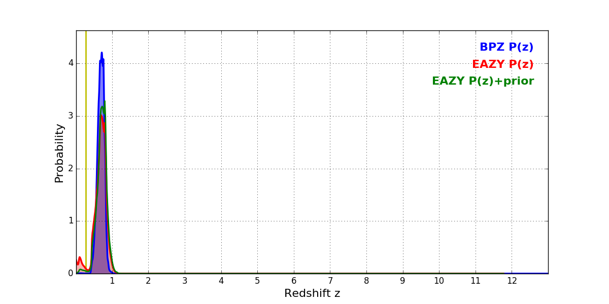 In P(z) plots: Yellow lines mark the cluster redshift z = 0.282,