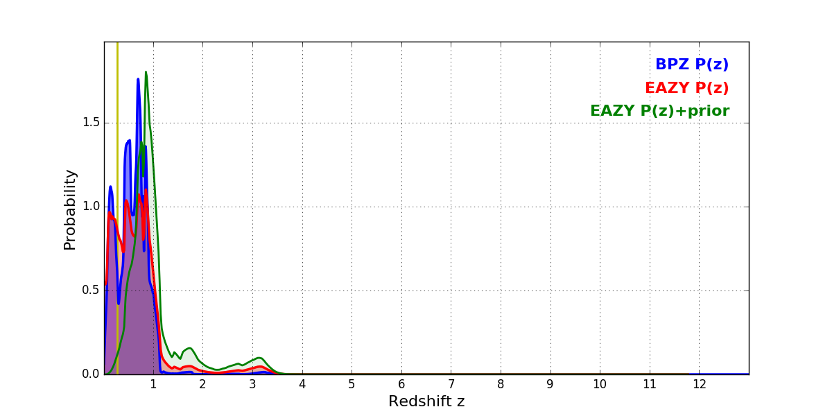 In P(z) plots: Yellow lines mark the cluster redshift z = 0.282,