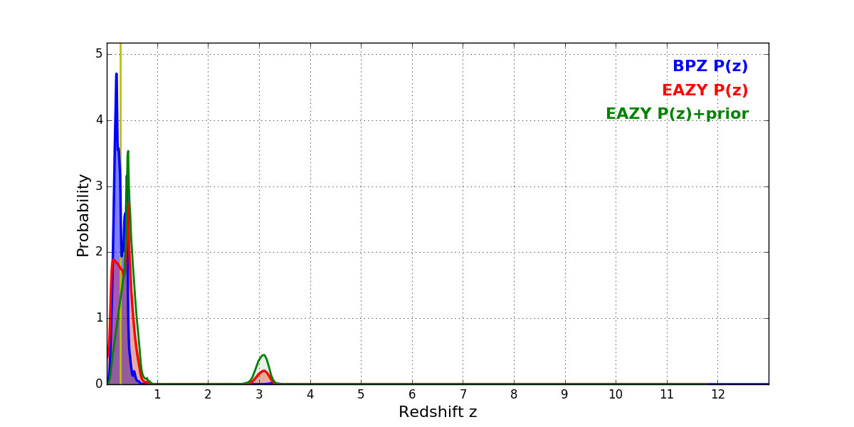 In P(z) plots: Yellow lines mark the cluster redshift z = 0.282,