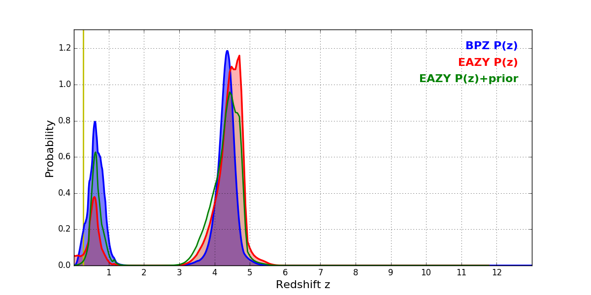 In P(z) plots: Yellow lines mark the cluster redshift z = 0.282,