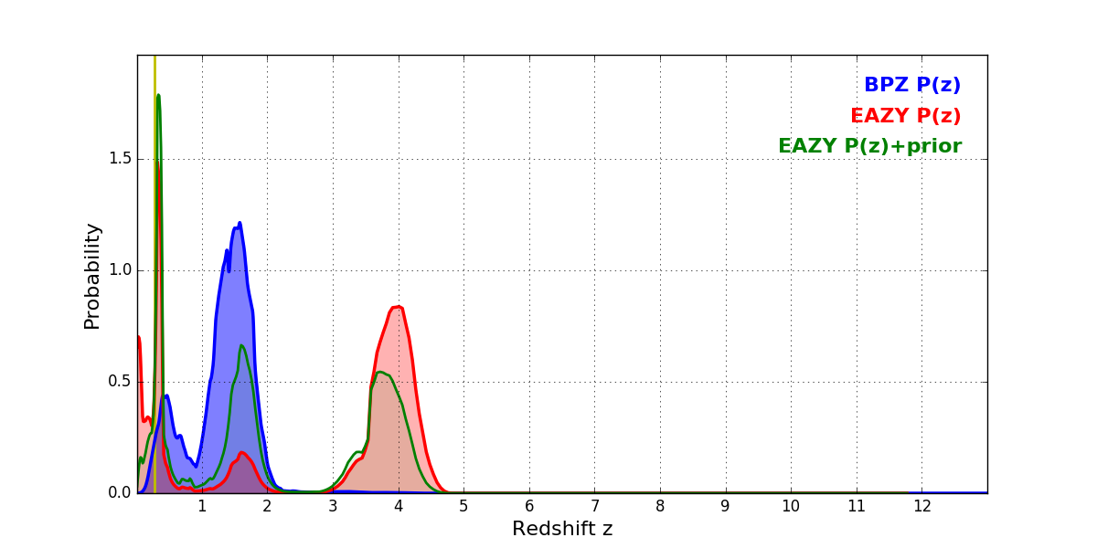 In P(z) plots: Yellow lines mark the cluster redshift z = 0.282,