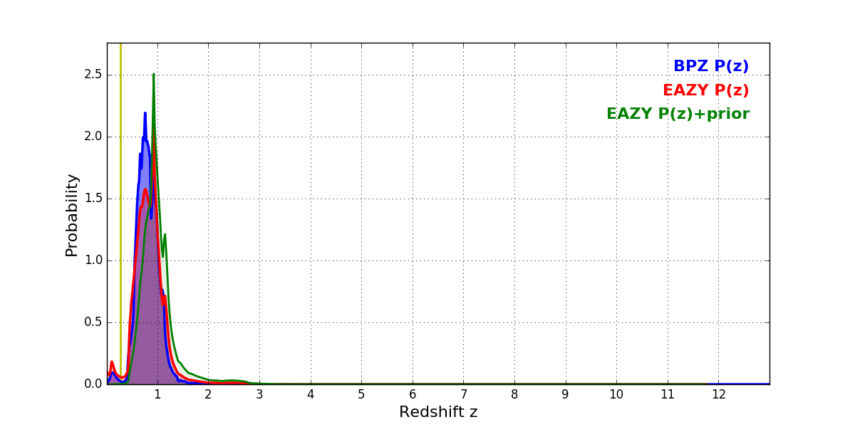 In P(z) plots: Yellow lines mark the cluster redshift z = 0.282,
