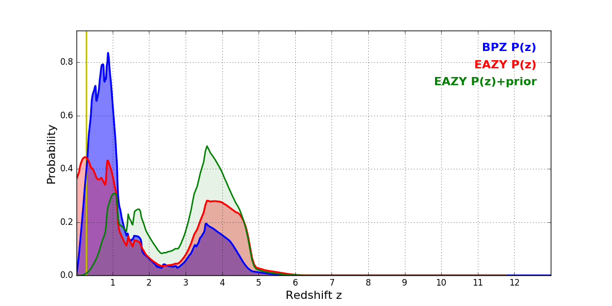 In P(z) plots: Yellow lines mark the cluster redshift z = 0.282,