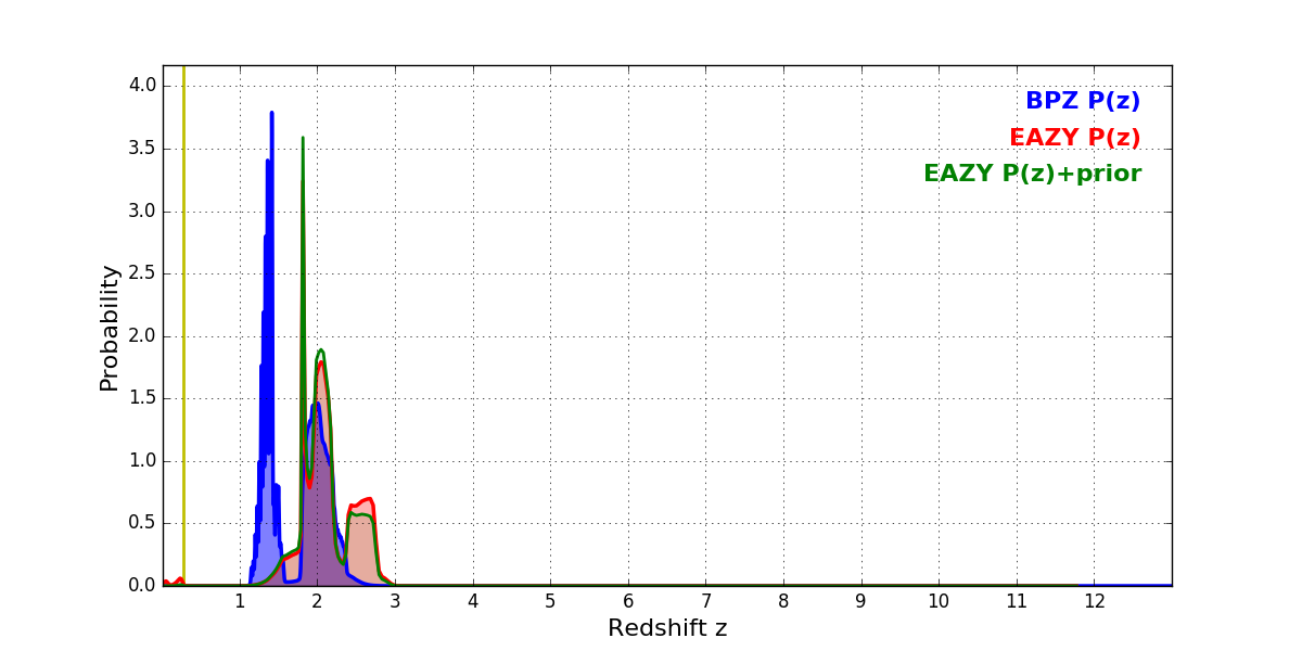 In P(z) plots: Yellow lines mark the cluster redshift z = 0.282,