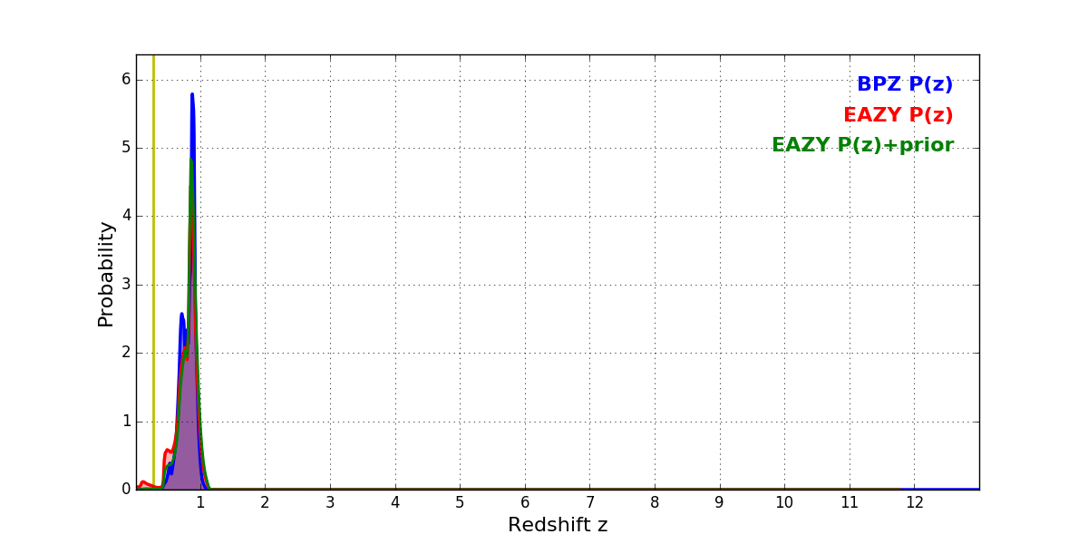In P(z) plots: Yellow lines mark the cluster redshift z = 0.282,