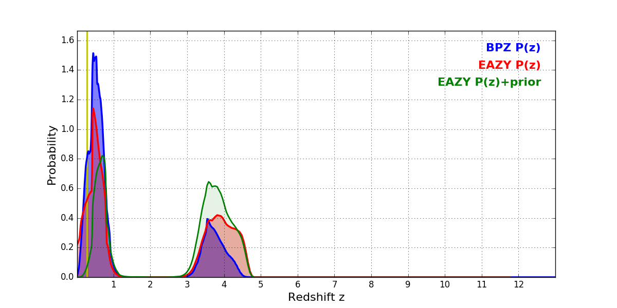 In P(z) plots: Yellow lines mark the cluster redshift z = 0.282,