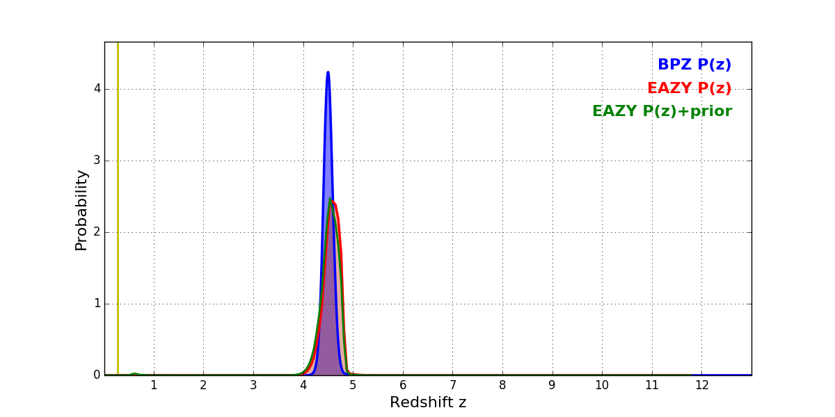 In P(z) plots: Yellow lines mark the cluster redshift z = 0.282,
