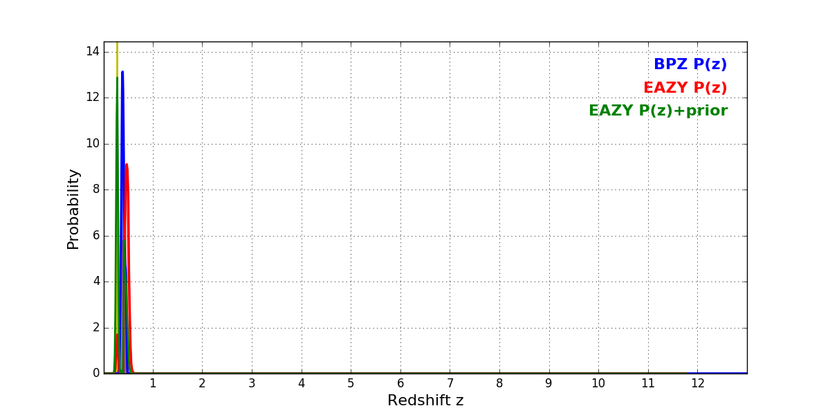 In P(z) plots: Yellow lines mark the cluster redshift z = 0.282,