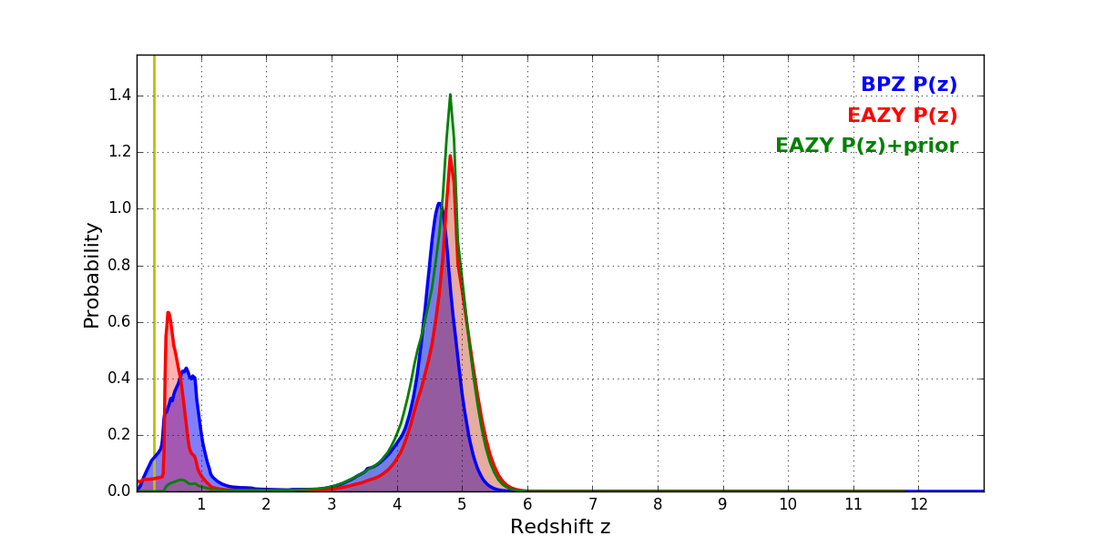 In P(z) plots: Yellow lines mark the cluster redshift z = 0.282,
