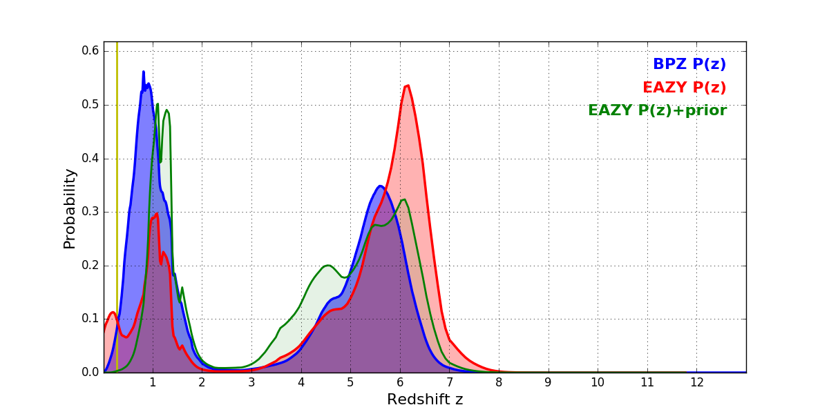 In P(z) plots: Yellow lines mark the cluster redshift z = 0.282,