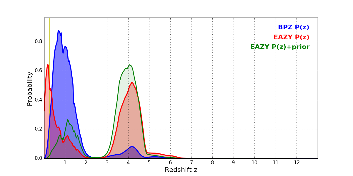 In P(z) plots: Yellow lines mark the cluster redshift z = 0.282,