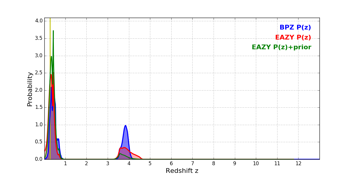 In P(z) plots: Yellow lines mark the cluster redshift z = 0.282,