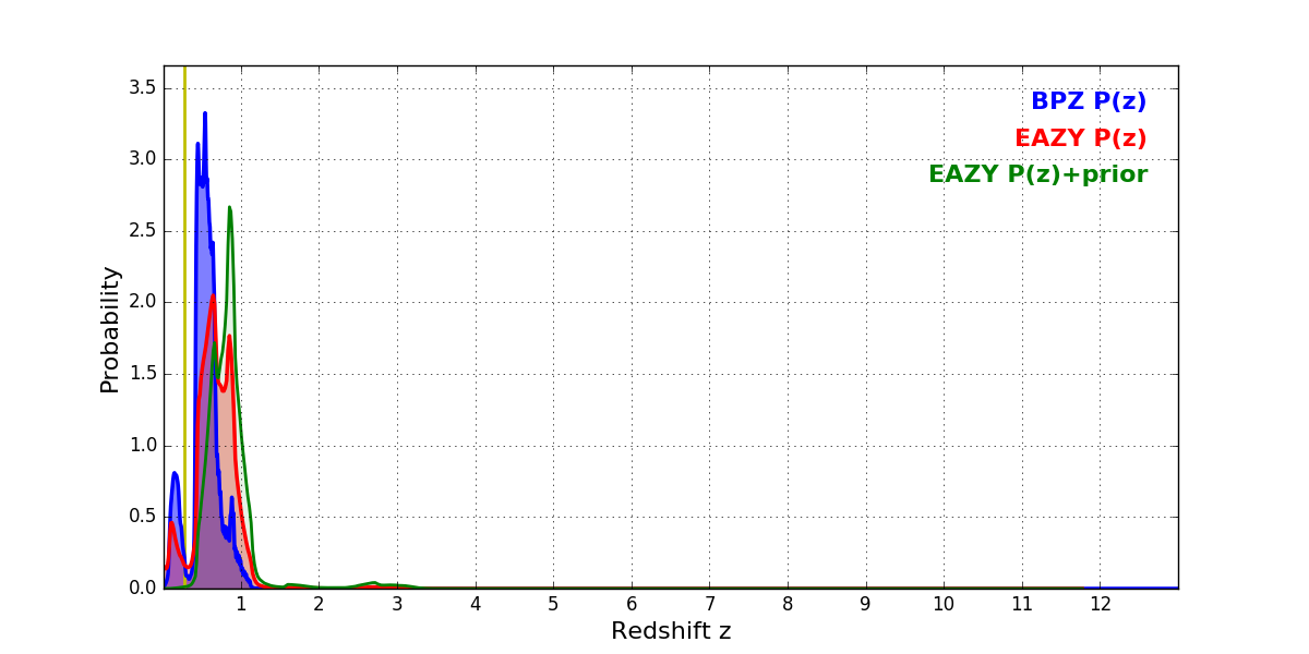 In P(z) plots: Yellow lines mark the cluster redshift z = 0.282,