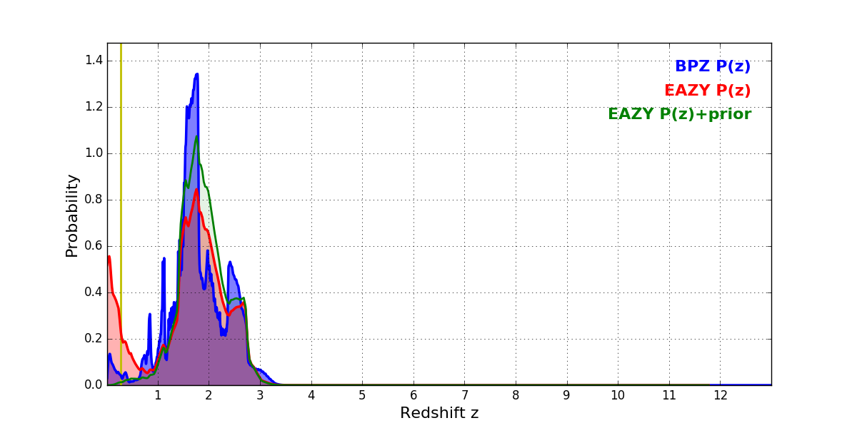 In P(z) plots: Yellow lines mark the cluster redshift z = 0.282,