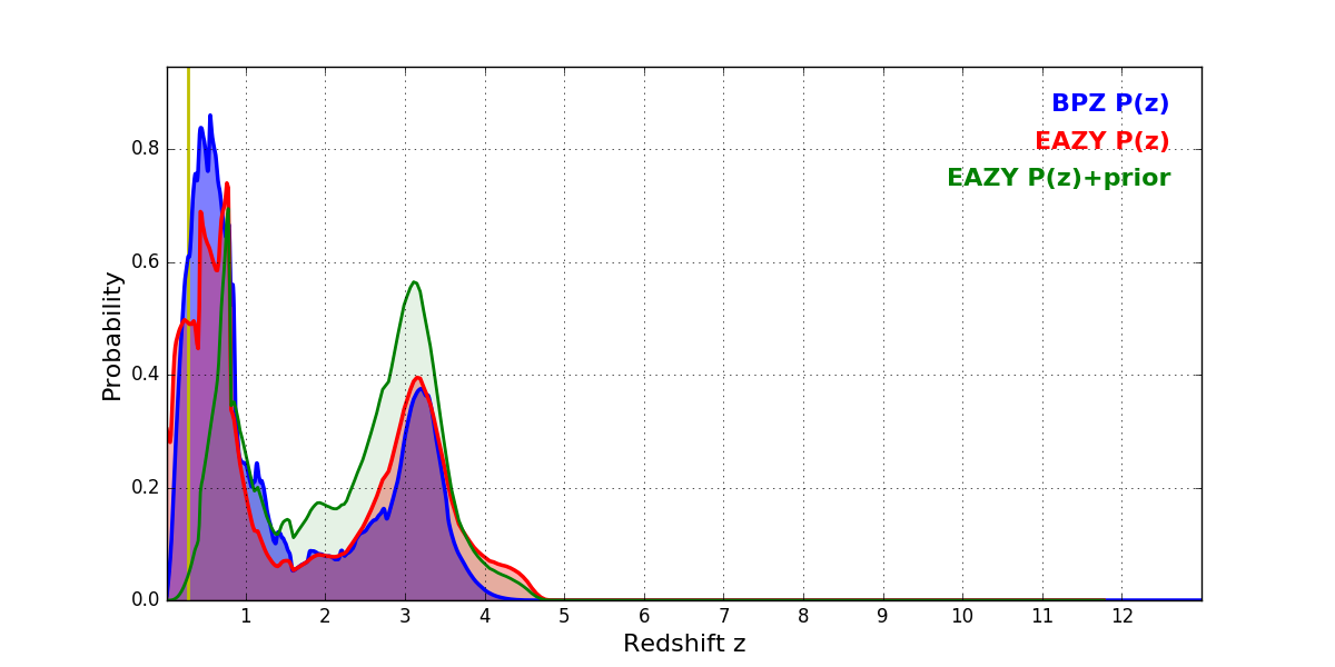 In P(z) plots: Yellow lines mark the cluster redshift z = 0.282,