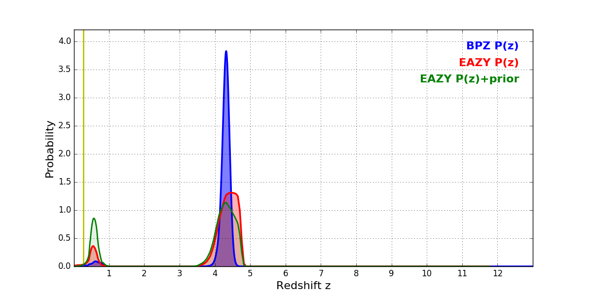 In P(z) plots: Yellow lines mark the cluster redshift z = 0.282,
