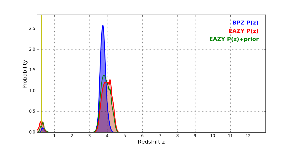 In P(z) plots: Yellow lines mark the cluster redshift z = 0.282,