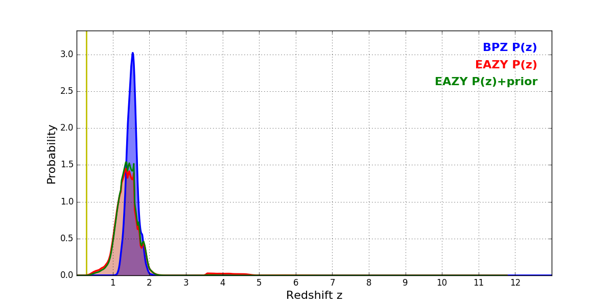 In P(z) plots: Yellow lines mark the cluster redshift z = 0.282,