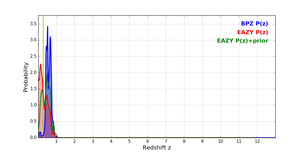 In P(z) plots: Yellow lines mark the cluster redshift z = 0.282,