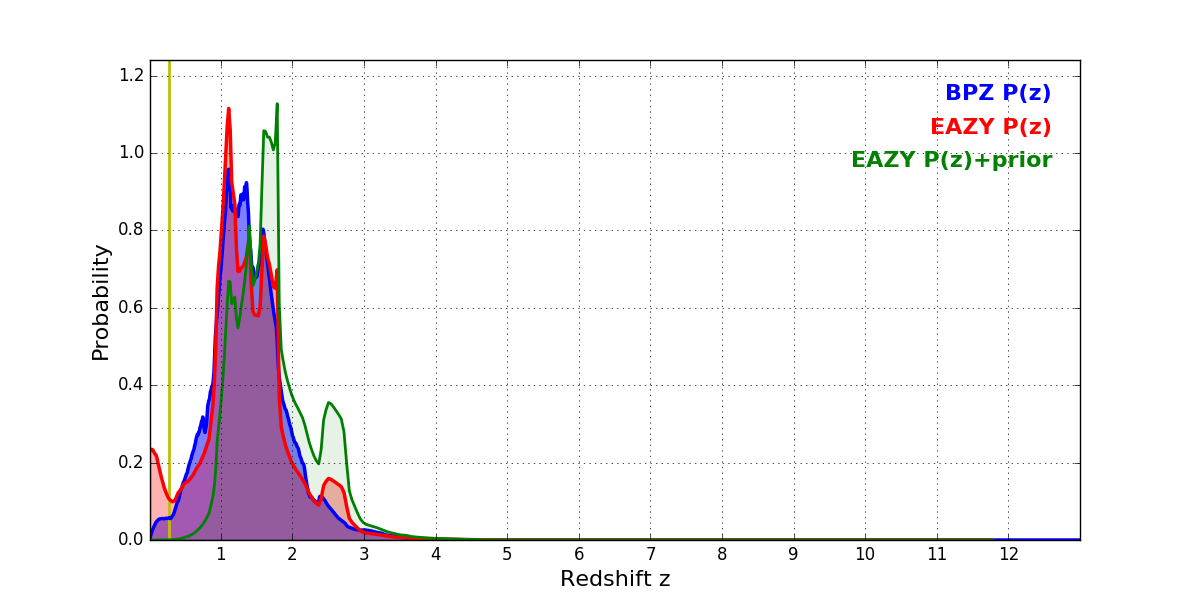In P(z) plots: Yellow lines mark the cluster redshift z = 0.282,