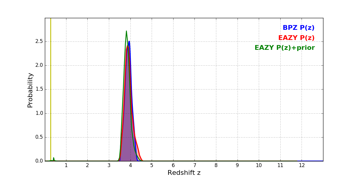 In P(z) plots: Yellow lines mark the cluster redshift z = 0.282,