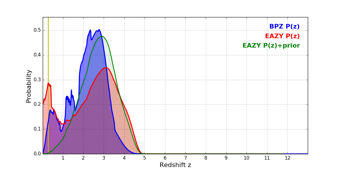 In P(z) plots: Yellow lines mark the cluster redshift z = 0.282,