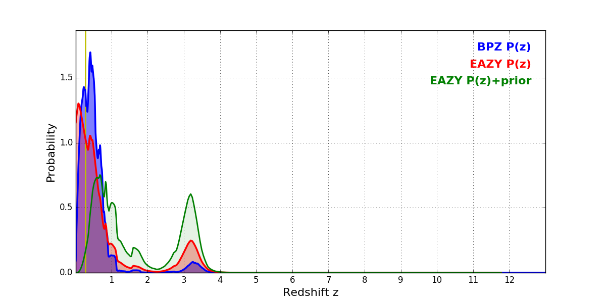 In P(z) plots: Yellow lines mark the cluster redshift z = 0.282,