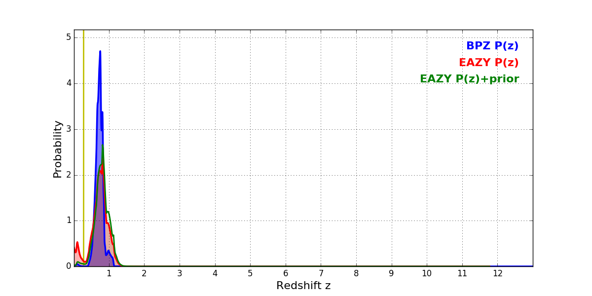 In P(z) plots: Yellow lines mark the cluster redshift z = 0.282,