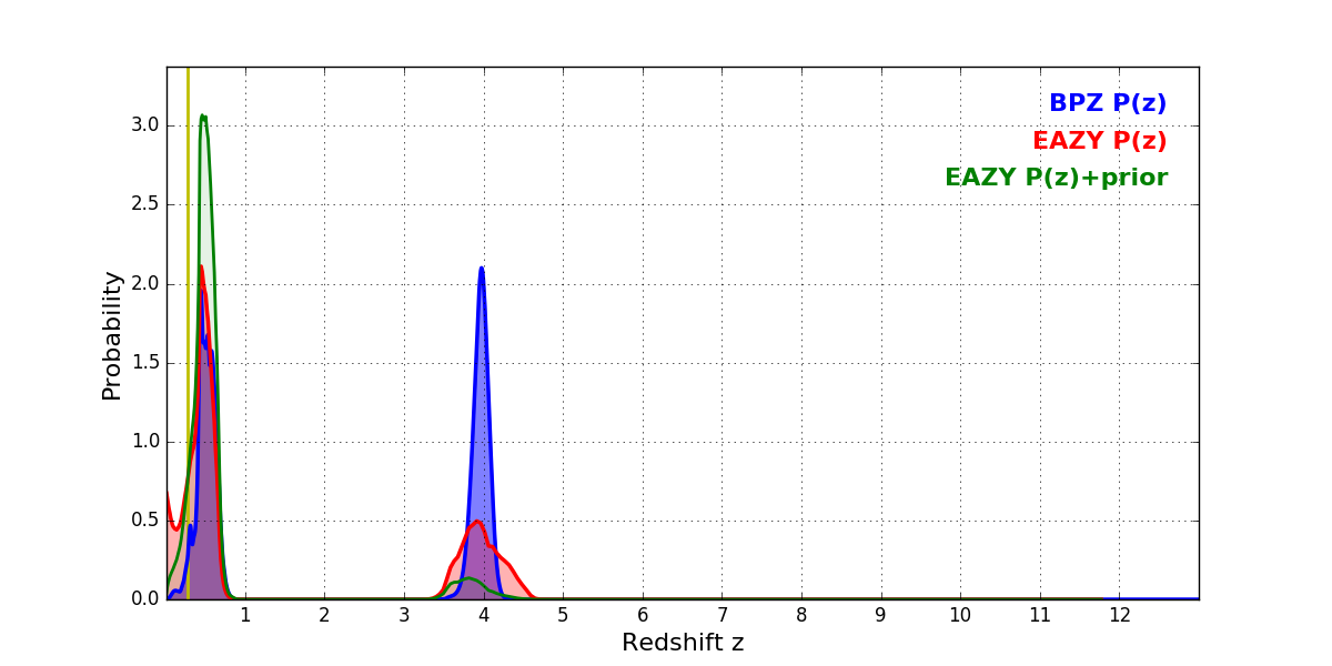 In P(z) plots: Yellow lines mark the cluster redshift z = 0.282,