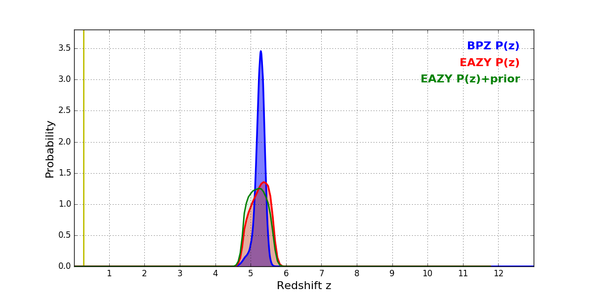 In P(z) plots: Yellow lines mark the cluster redshift z = 0.282,