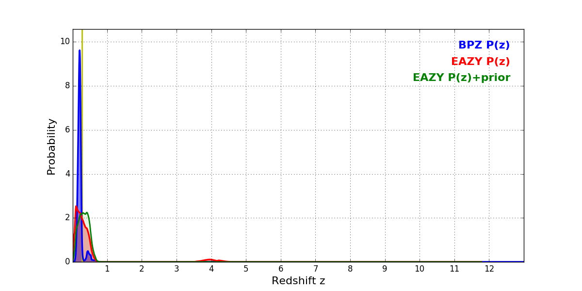 In P(z) plots: Yellow lines mark the cluster redshift z = 0.282,