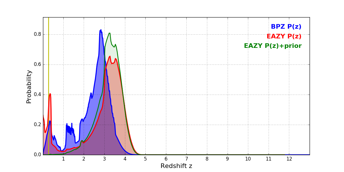 In P(z) plots: Yellow lines mark the cluster redshift z = 0.282,