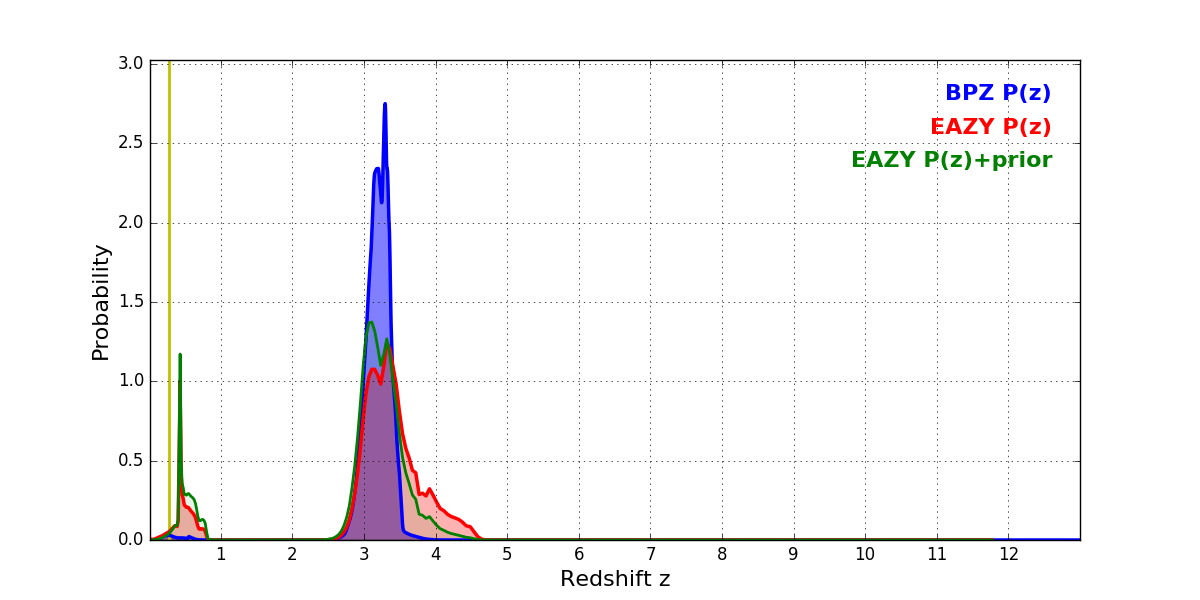 In P(z) plots: Yellow lines mark the cluster redshift z = 0.282,