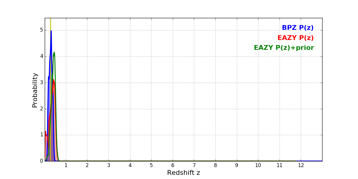 In P(z) plots: Yellow lines mark the cluster redshift z = 0.282,