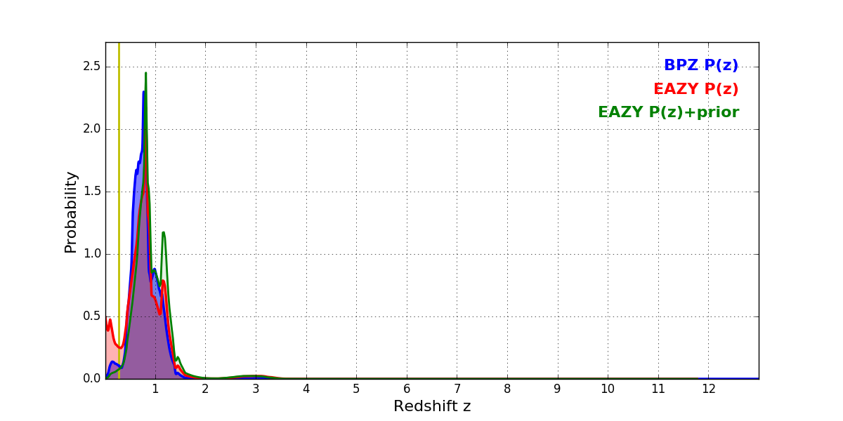 In P(z) plots: Yellow lines mark the cluster redshift z = 0.282,
