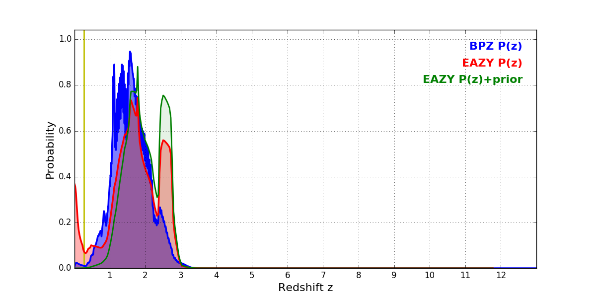 In P(z) plots: Yellow lines mark the cluster redshift z = 0.282,