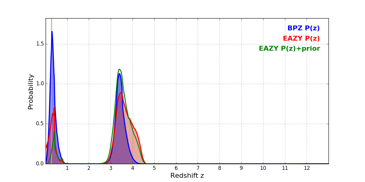 In P(z) plots: Yellow lines mark the cluster redshift z = 0.282,
