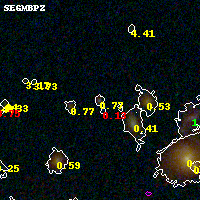Object #2255 x,y = (1614, 3096) RA, Dec = (02:45:35.424, -53:01:51.24) = (41.39760, -53.03090) BPZ = 0.767 [0.543--0.933] type = 9.00 (SB2_B10) chisq2 = 0.37 ODDS = 0.50 z_cluster = 0.300