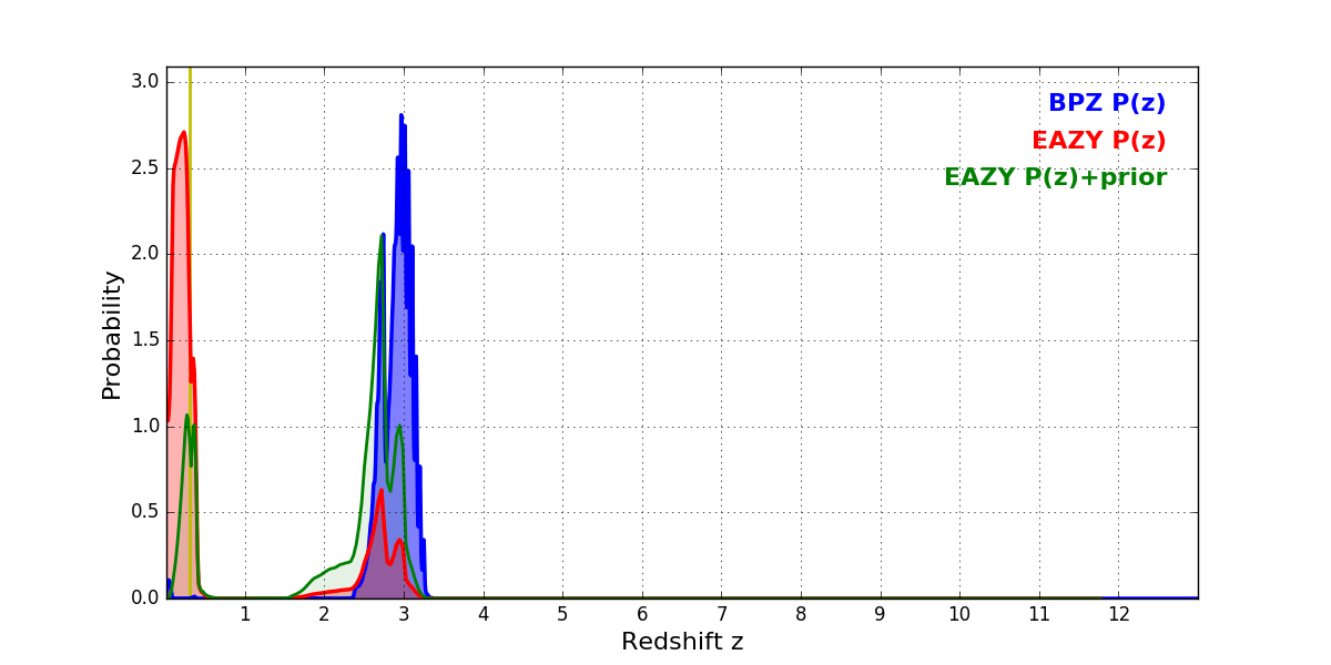 In P(z) plots: Yellow lines mark the cluster redshift z = 0.300,
