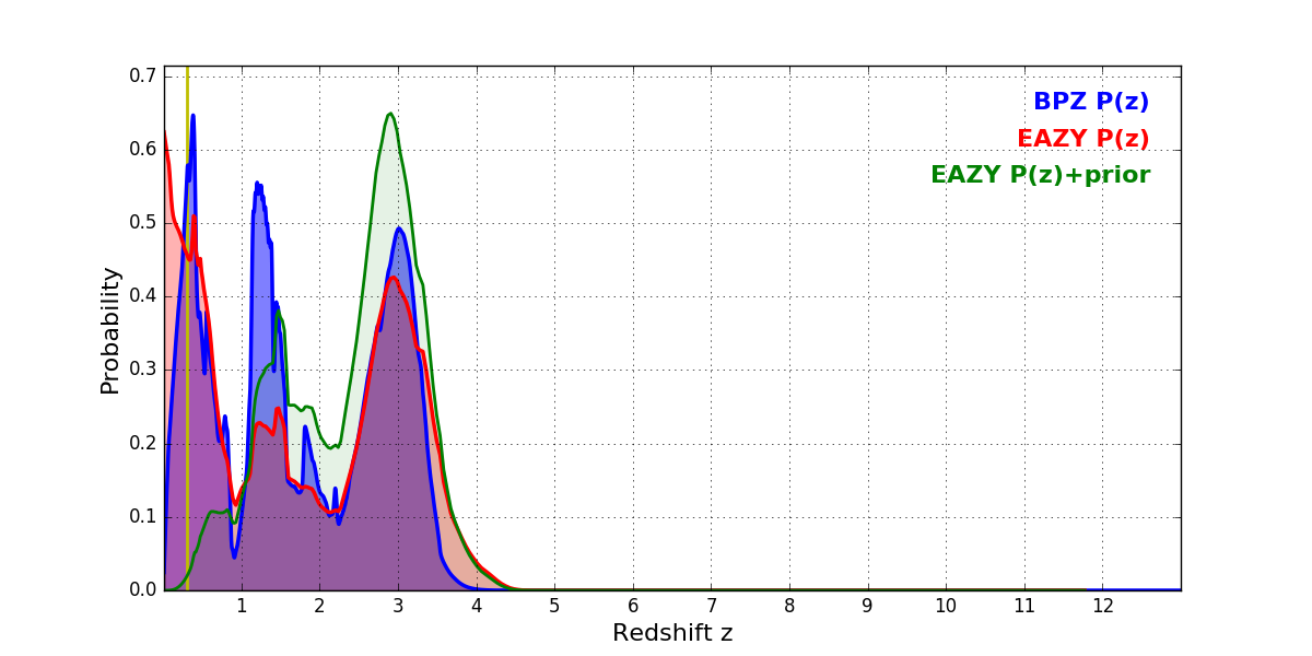 In P(z) plots: Yellow lines mark the cluster redshift z = 0.300,