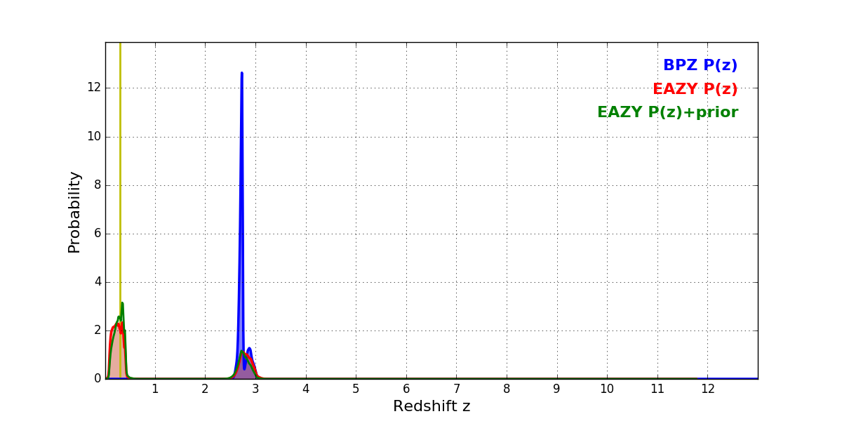 In P(z) plots: Yellow lines mark the cluster redshift z = 0.300,