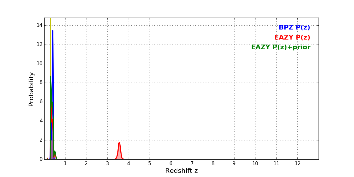 In P(z) plots: Yellow lines mark the cluster redshift z = 0.300,