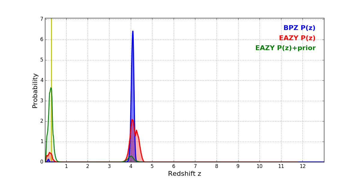 In P(z) plots: Yellow lines mark the cluster redshift z = 0.300,