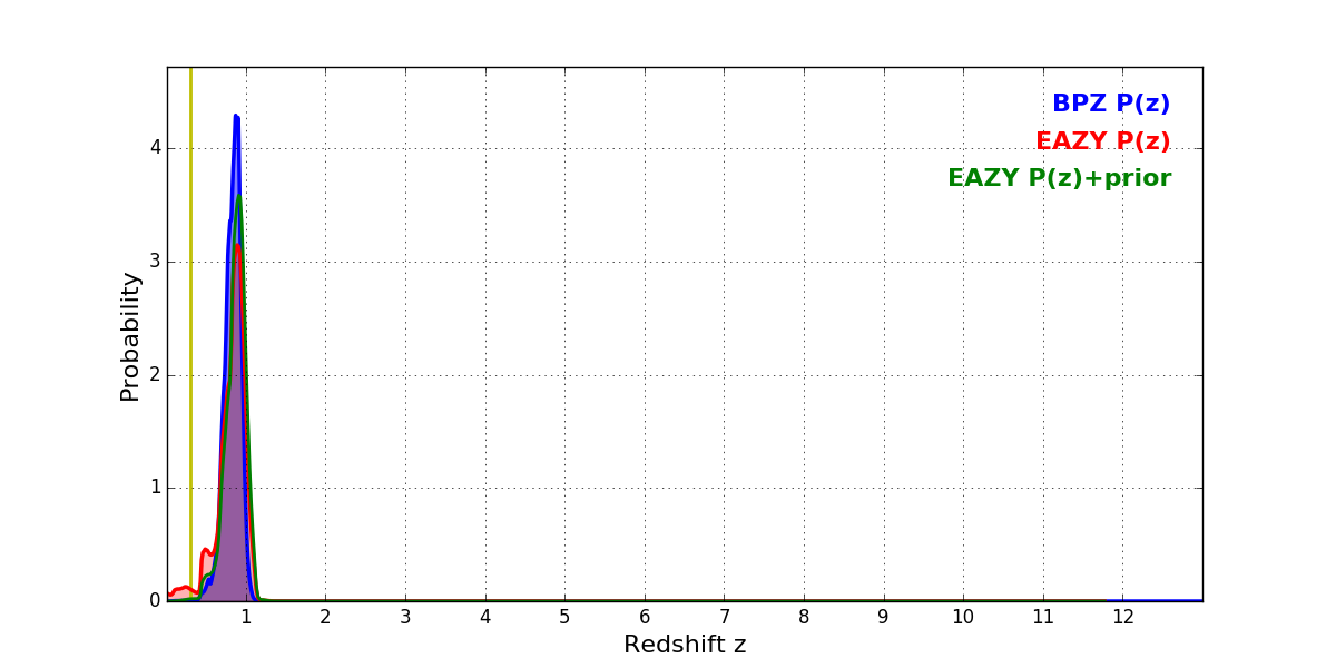 In P(z) plots: Yellow lines mark the cluster redshift z = 0.300,