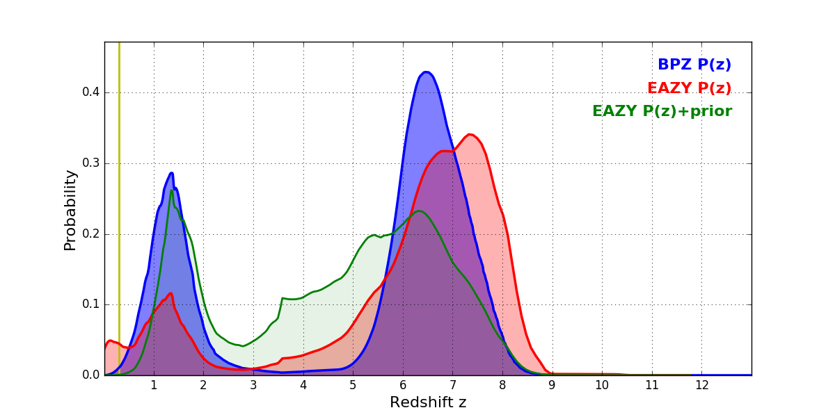 In P(z) plots: Yellow lines mark the cluster redshift z = 0.300,