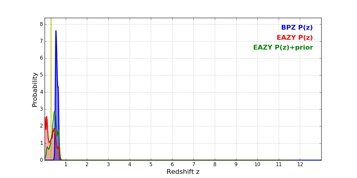 In P(z) plots: Yellow lines mark the cluster redshift z = 0.300,